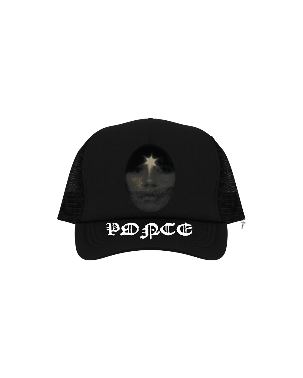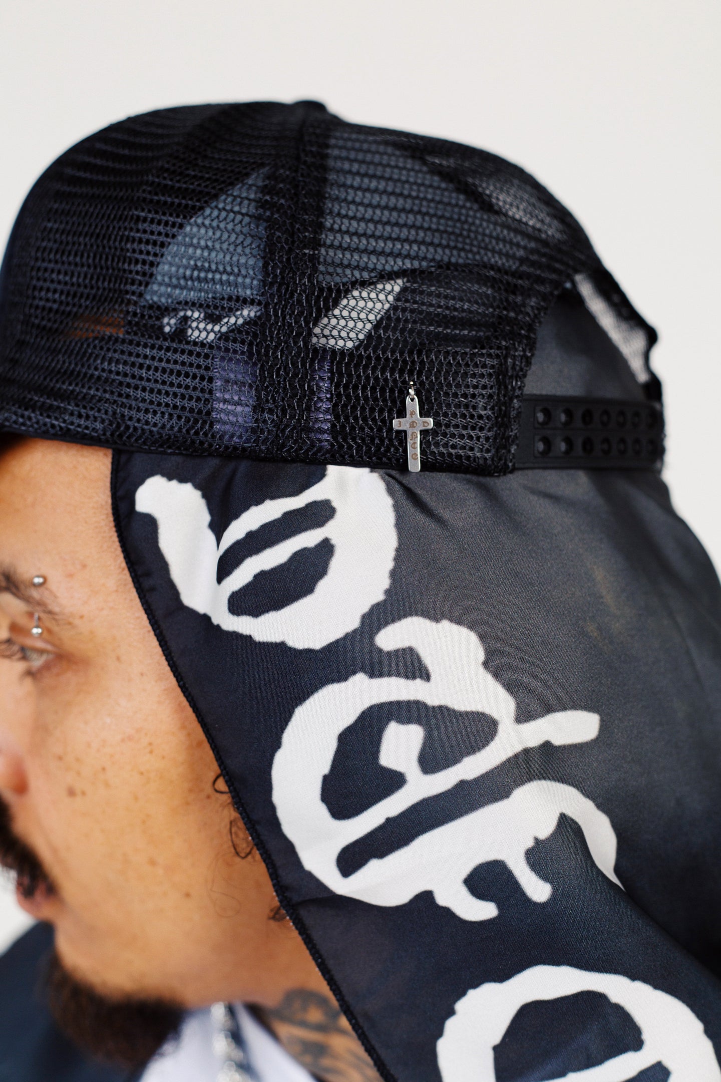 Trucker em estampa DTF preta, aba curva. Pingente em metal gravado PONCE ID.